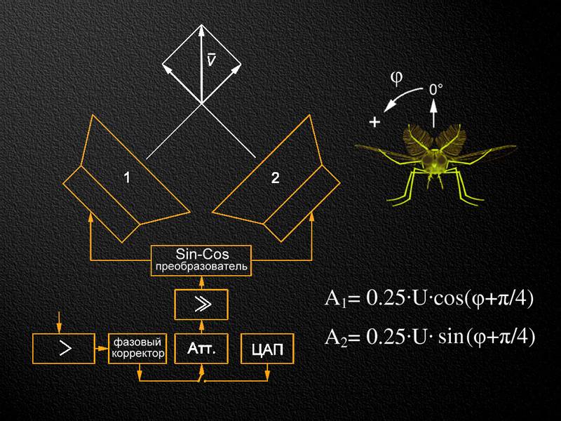 осями под прямым углом. Подопытное насекомое фиксировали на пересечении акустических